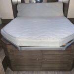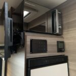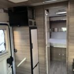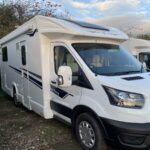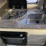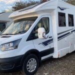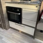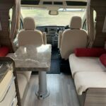 This 4 berth with 4 travel seats motorhome is fully equipped with a Rear bedroom with a fixed island bed, an Electric drop-down double bed at the front, a Separate shower cubicle, and a bathroom to the rear of the van. The kitchen is equipped with a 3 burner hob, oven, grill, microwave, fridge with freezer compartment. The bathroom is fully equipped with a Thetford toilet, shower, and washbasin