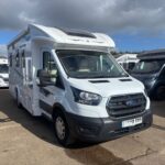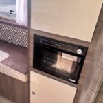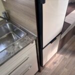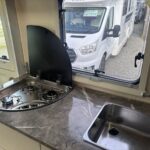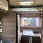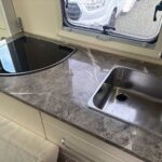 - Kitchen equipped with Thetford 3-way fridge freezer, sink, and 3-burner gas hob