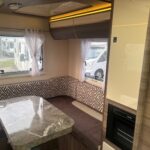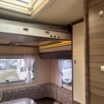 5 berth 5 belts. Rear U shape Lounge with an electric bed above to sleep 2. Front electric drop-down double bed with the front dinette, which converts into a single bed. Kitchen equipped with Thetford fridge freezer, sink, and 3 burner gas hob. Bathroom with shower cubicle, Thetford cassette toilet, and vanity washbasin
