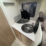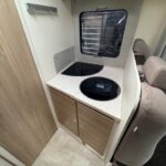 - The kitchen area is equipped with a 3 burner hob, Thetford oven, Xl fridge freezer and a sink