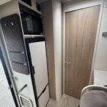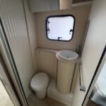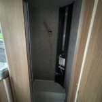 - The bathroom consists of a Thetford cassette toilet and washbasin with a separate shower cubicle