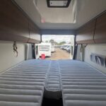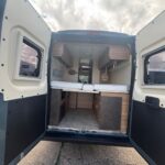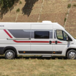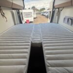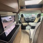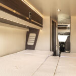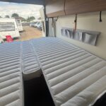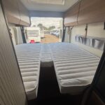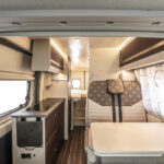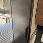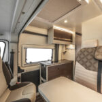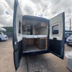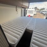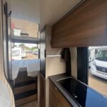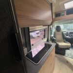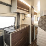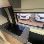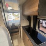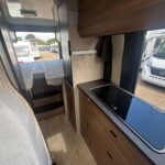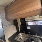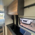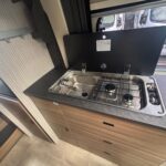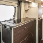 - Kitchen unit equipped with 2 burner hob, sink, and 90L compressor fridge mounted at eye-level for easy access, oven