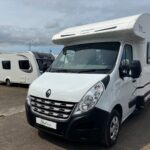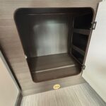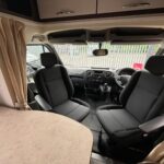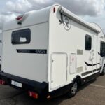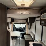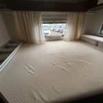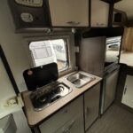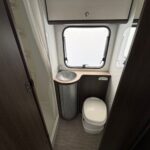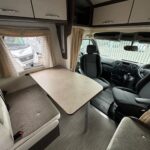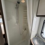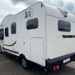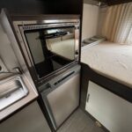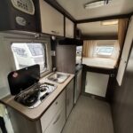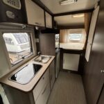 - The kitchen is equipped with a 2 burner hob, oven, grill, fridge with freezer compartment, and sink