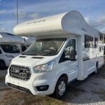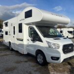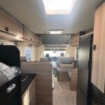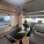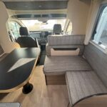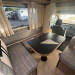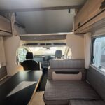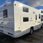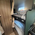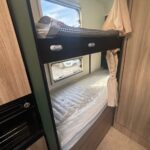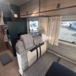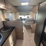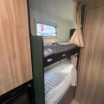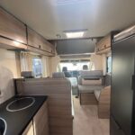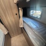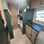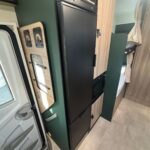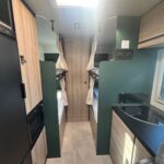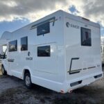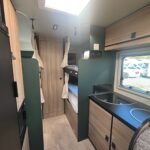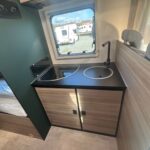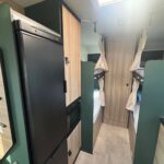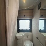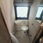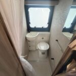 - Rear washroom equipped with a shower cubicle, a washbasin, and a cassette toilet