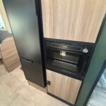 - Kitchen unit equipped with 3 3-burner hob, sink, and a 141L fridge with freezer compartment