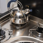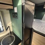 - Kitchen unit equipped with 3 burner hob, sink, and a 141L fridge with freezer compartment