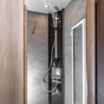- The new layout consists of a separate shower cubicle and cassette toilet with a washbasin
