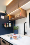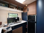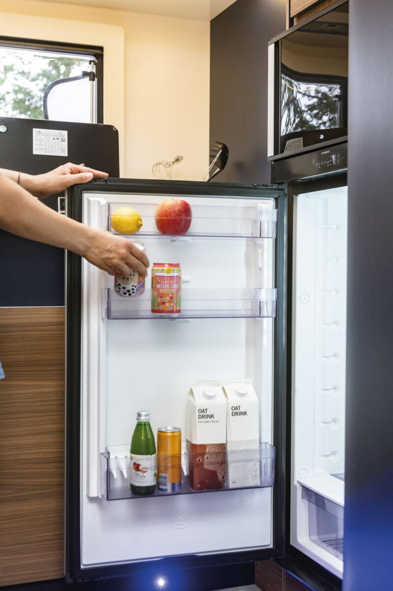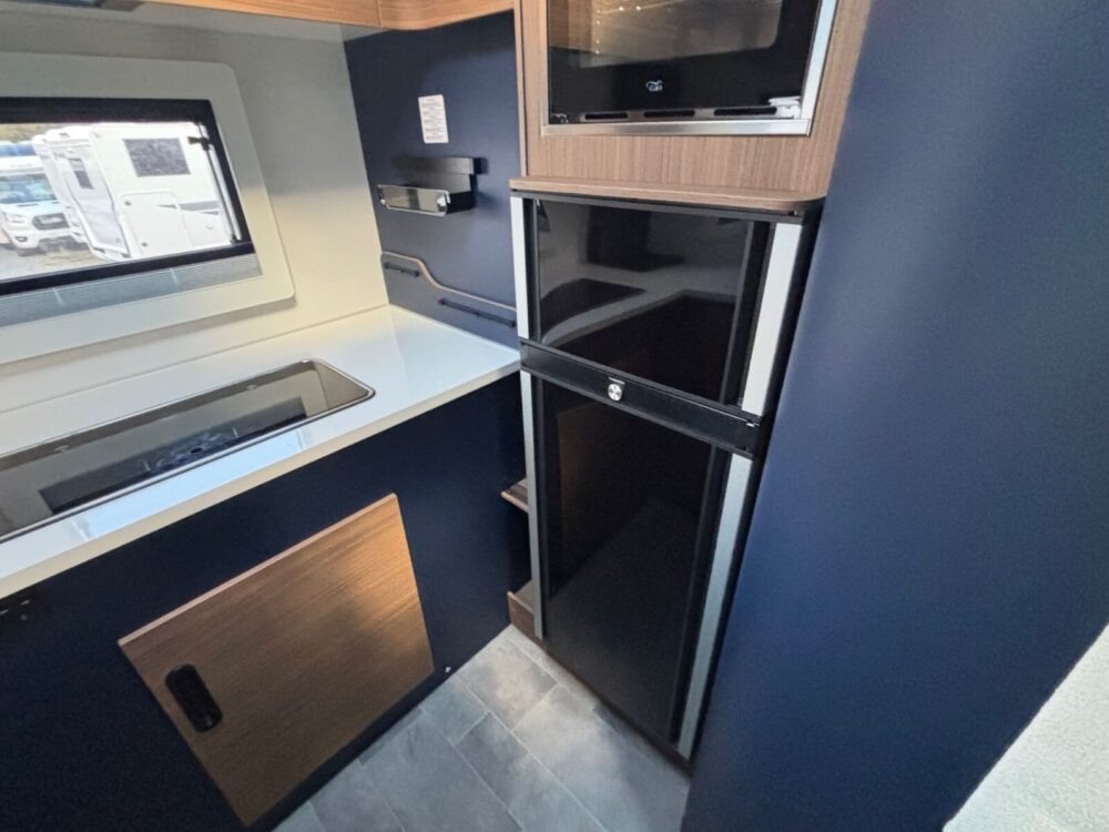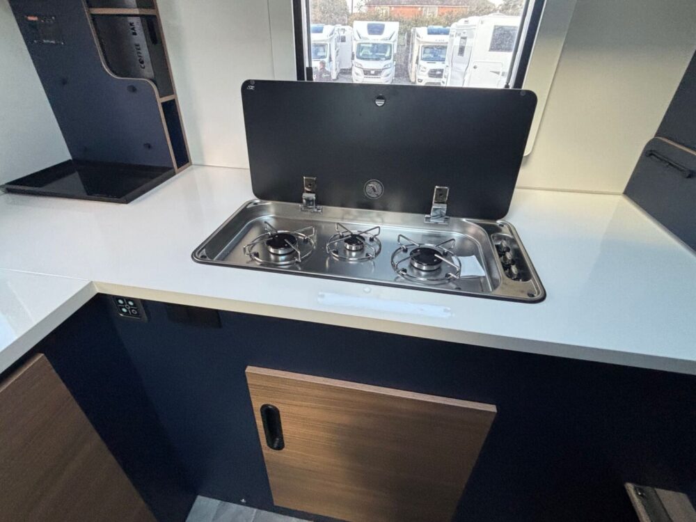 - Kitchen unit equipped with 3 burner hob, sink, and a 141L fridge with freezer compartment