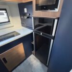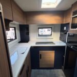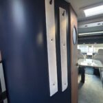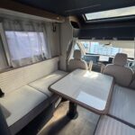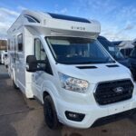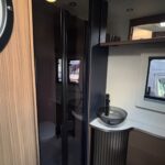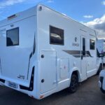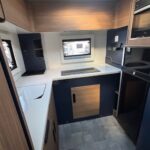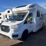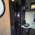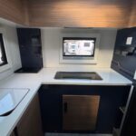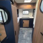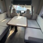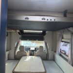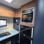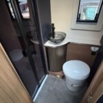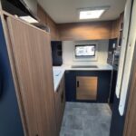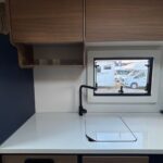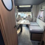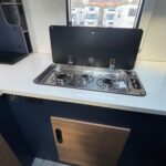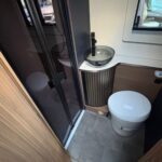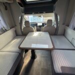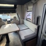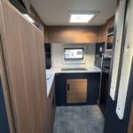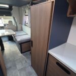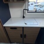 A 4-berth motorhome with 4 travel seats. Consists of a rear L-Shaped Kitchen, an XL electric drop-down double bed at the front. Kitchen unit equipped with 3-burner hob, sink, and a 141L fridge with freezer compartment. This new layout consists of a separate shower cubicle and cassette toilet with a washbasin. Based on the 2.0L 165bhp Euro 6D Ford Transit.