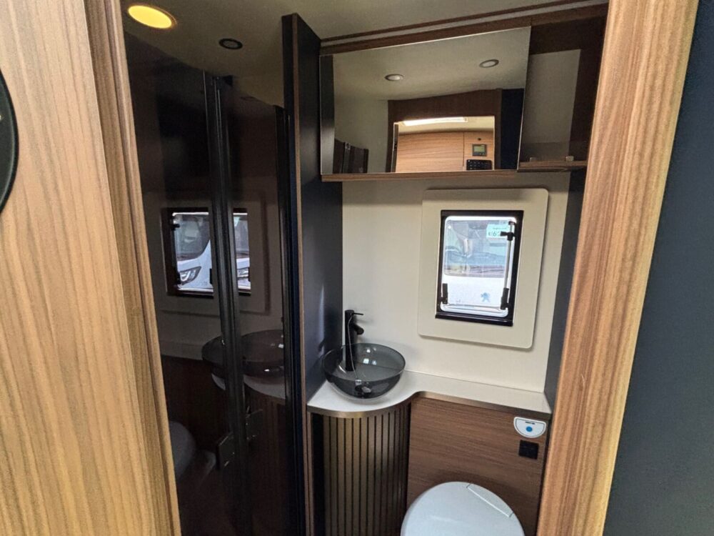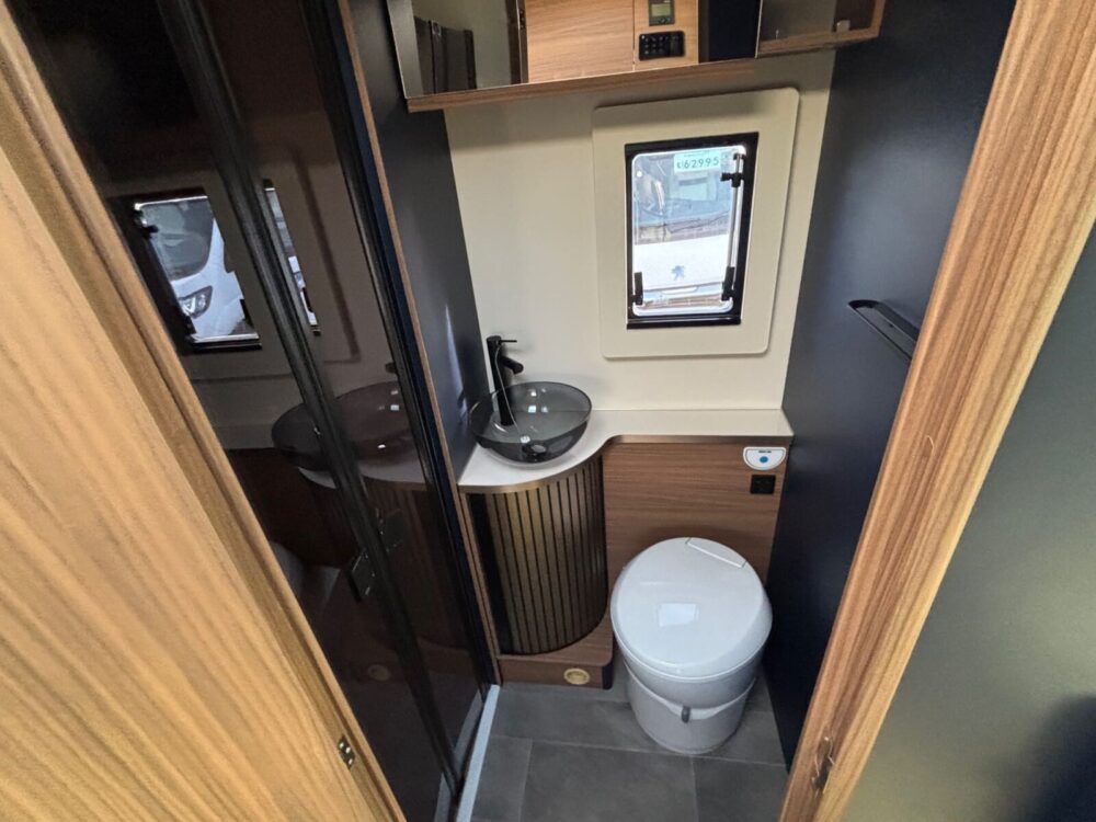 - The new layout consists of a Shower cubicle and cassette toilet with a washbasin