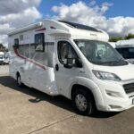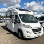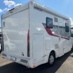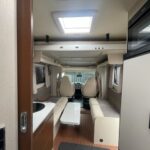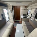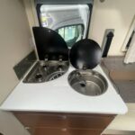 - The kitchen area is equipped with a 3 burner hob, sink, Thetford XL fridge freezer, and a Thetford oven