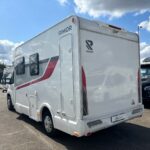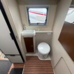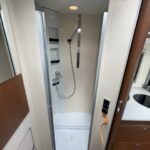 - The rear bathroom contains a Thetford cassette toilet, vanity washbasin, and a separate shower cubicle