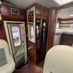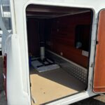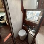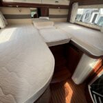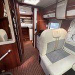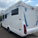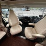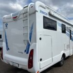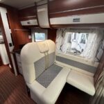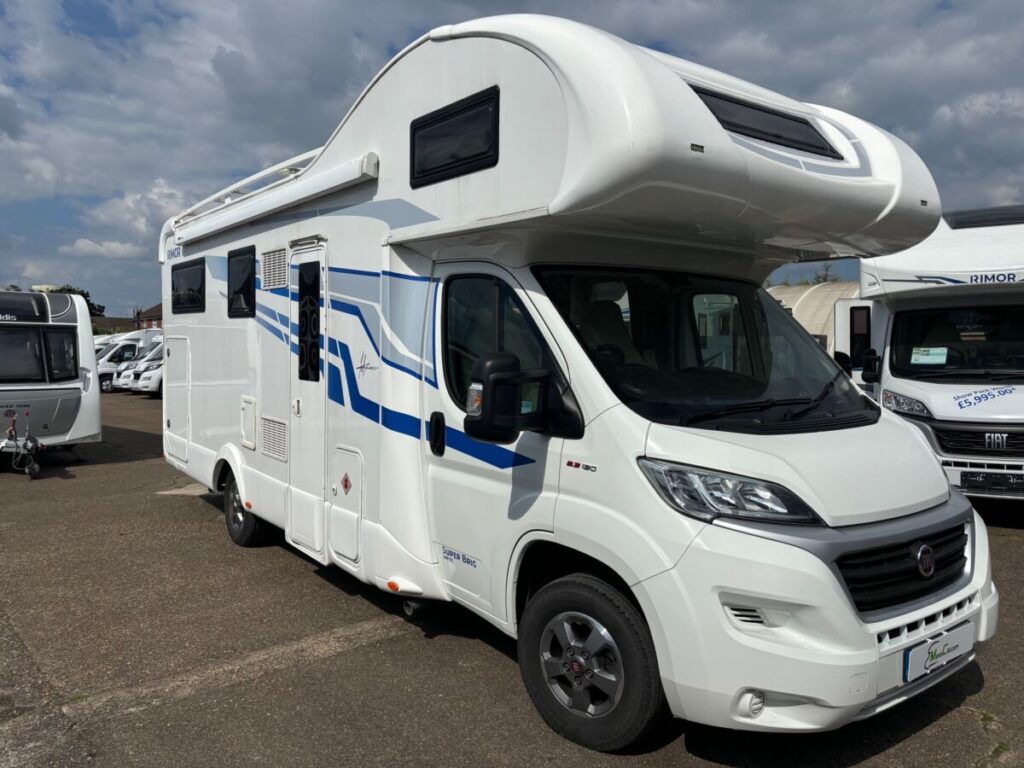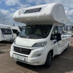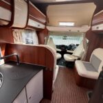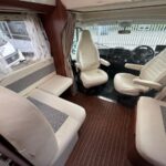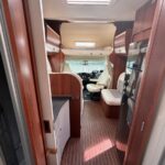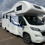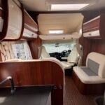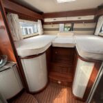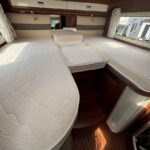 A 5-berth motorhome. The layout consists of rear fixed single beds which can convert into a comfortable double bed. A large and comfortable over-cab double bed. The front dinette converts to a small single-bed. The kitchen area is well equipped with a sink, 3 burner gas hob, large fridge freezer and Dometic grill. Separate shower cubicle and separate Thetford cassette toilet and vanity washbasin. Lots of storage throughout including a large garage space under the rear bed.