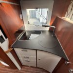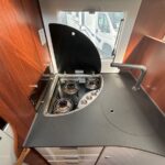 • The kitchen area is well equipped with a sink, 3 burner gas hob, large fridge freezer and Dometic grill