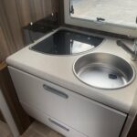 - The kitchen is equipped with an oven, grill, 3 burner hob, and sink