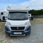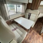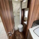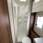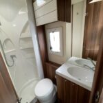 - The rear bathroom is equipped with a separate shower cubicle, Thetford cassette toilet, and vanity washbasin