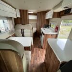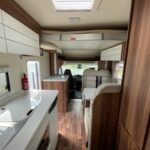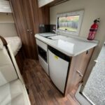 - The kitchen is equipped with a Dometic fridge with a freezer compartment, a 3 burner Dometic hob, a SMEV oven and grill, and a sink.