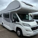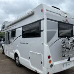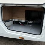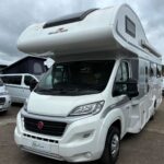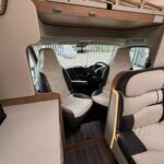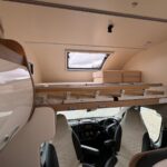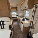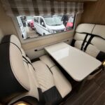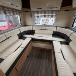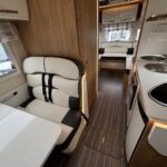 A 6-berth motorhome. The layout consists of a large double-over cab bed and the dinette area converts to a comfortable double bed. The rear u-shaped lounge converts to a double bed. The central kitchen is well-equipped with a sink, 3 burner gas hob, Thetford oven and grill and fridge freezer. The bathroom is spacious and equipped with a Thetford cassette toilet, vanity washbasin and shower cubicle. Garage space under the rear lounge.