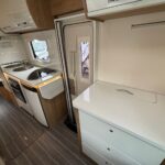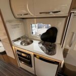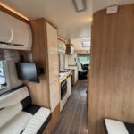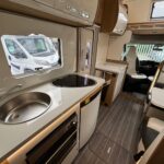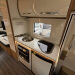 • The central kitchen is well-equipped with a sink, 3 burner gas hob, Thetford oven and grill and fridge freezer
