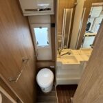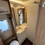• The bathroom is spacious and equipped with a Thetford cassette toilet, vanity washbasin and shower cubicle