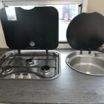 - The kitchen is equipped with a 3 burner hob, oven, large fridge with freezer compartment, and sink.