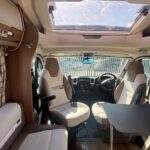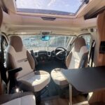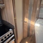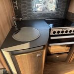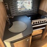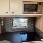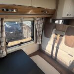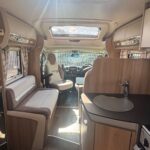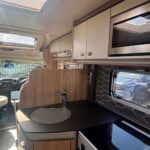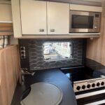 - The kitchen is well equipped with a Dometic 4-burner hob, oven and grill, sink, large fridge freezer and microwave