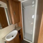 - The rear bathroom contains a Thetford cassette toilet, vanity washbasin, and shower cubicle