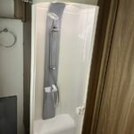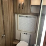 - The bathroom contains a shower, Thetford cassette toilet, and vanity washbasin