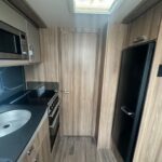 - The kitchen area is equipped with a hob, sink, microwave, oven and grill, and a Dometic fridge freezer