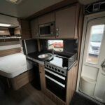 - Well-equipped kitchen with dual fuel hob, Dometic oven and grill, Dometic 3 way fridge with freezer compartment, sink, and microwave