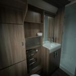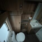 - Rear bathroom with Thetford cassette toilet, vanity washbasin, and a separate shower cubicle