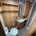 - The rear Bathroom contains a Thetford cassette toilet, vanity washbasin, and shower cubicle