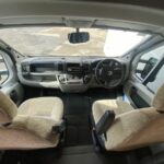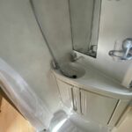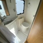 - The rear washroom contains a Thetford cassette toilet, vanity wash basin, and shower