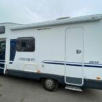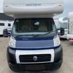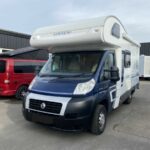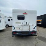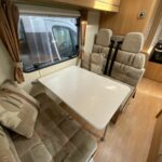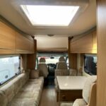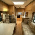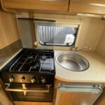 - The rear kitchen area consists of a 3 burner hob, sink, Thetford oven and grill, and a Thetford fridge with a freezer compartment