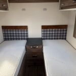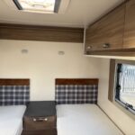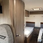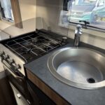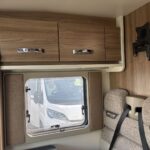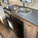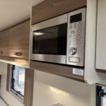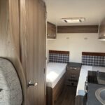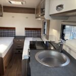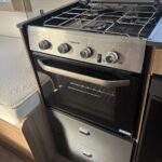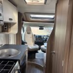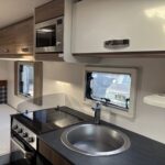 • The central kitchen is well equipped with a Thetford 3-burner hob, oven and grill, sink, Microwave and Dometic fridge freezer