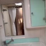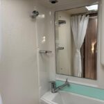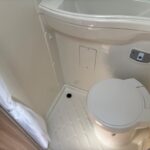- The washroom is spacious with a shower, Thetford cassette toilet, and vanity washbasin