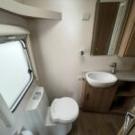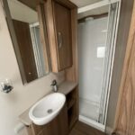 - Rear bathroom with shower cubicle, Thetford cassette toilet, and vanity washbasin