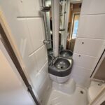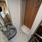 - The washroom is spacious and equipped with a Thetford cassette toilet, vanity washbasin and shower