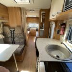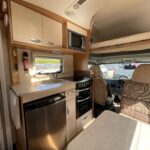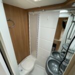 - The bathroom is equipped with a Thetford toilet, shower, and vanity wash basin