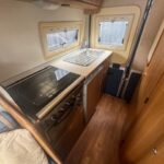 - The kitchen is well equipped with a sink, 4 burner hob, SMEV grill, and a Dometic fridge with a freezer compartment