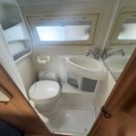 - Rear washroom with shower, Thetford cassette toilet, and a vanity washbasin