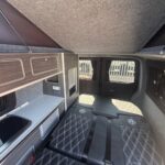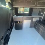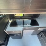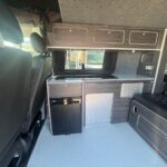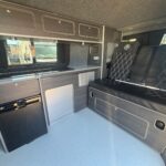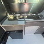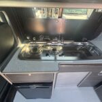 - There is a kitchen area with a 2 burner hob, sink and fridge
