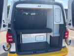 - The kitchen area is equipped with a gas hob, sink and fridge freezer